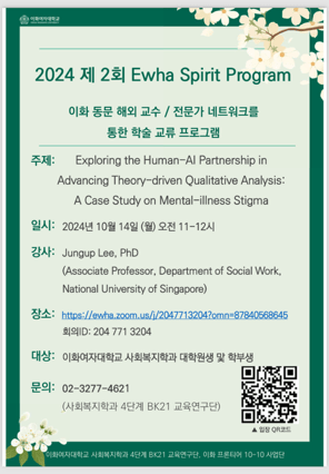 - [14 Oct 2024] Invited presentation (online), “Exploring the Human-AI Partnership in Advancing Theory-driven Qualitative Analysis: A Case Study on Mental-illness Stigma“, 2024 2nd Ewha Spirit Program, Ewha Womans University, South Korea.