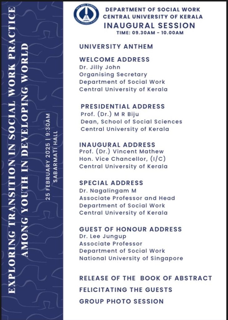 - [25 Feb 2025] International Conference on Social Work 2025, Exploring Transition in Social Work Practice Among Youth in Developing World, keynote speech. Department of Social Work, Central University of Kerala, India.