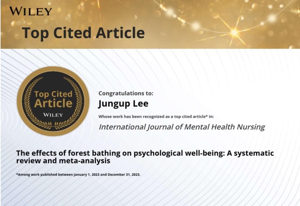 - Top 10 most-cited publication of 2023. “The Effects of Forest Bathing on Psychological Well-being: A Systematic Review and Meta-analysis” International Journal of Mental Health Nursing.